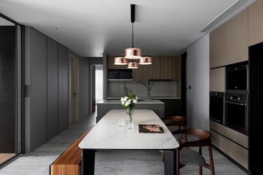 至於餐椅的選擇上,分子設計則認為要注意椅子與空間的關係,選購時要注意用餐空間的大小。與客廳的主人椅或休閒椅不同,餐椅要格外注意高度,實際可以自己試坐看看,依家中人員的高矮坐相對應的調整。如果有加椅墊,也要把其厚度算進去,避免讓使用者不舒服。此外餐椅移動的機率很高,分子室內設計建議可以選擇比較輕便的材質,避免選購太重的椅子。在空間與預算允許的情況下,可以選有扶手的餐椅,除了一家人吃飯聊天舒適外,偶爾邀請朋友們來家裡玩,座位不夠時也可善加利用。